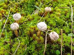 Tulostoma is a genus of over 100 species of fungi in the family Agaricaceae. Commonly known as stalked puffballs, the cosmopolitan genus consists of species which produce small fruit bodies, characterized by stalks inserted in a socket at the base of the spherical spore-sac opened by a small and apical mouth. The spore-sac contains gleba, a mixture of spores and associated cells; at maturity, the spores are released through one or more apical pores. Tulostoma species prefer xeric microhabitats, savannahs and deserts, and are saprobic—obtaining nutrients by decomposing roots, buried wood and other organic material of plant origin.[1]