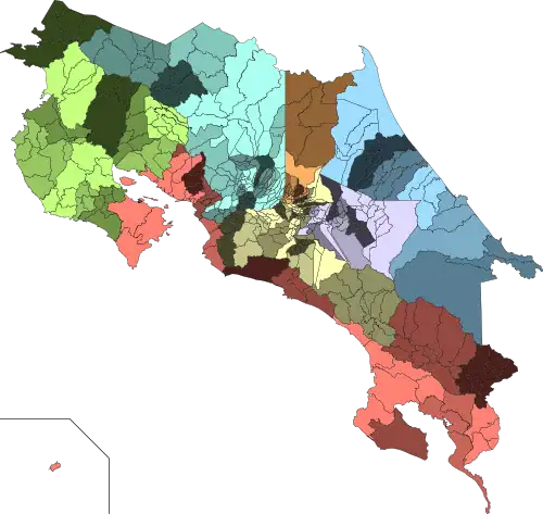 Colored map of Cantons of Costa Rica, with district borders visible in each canton.