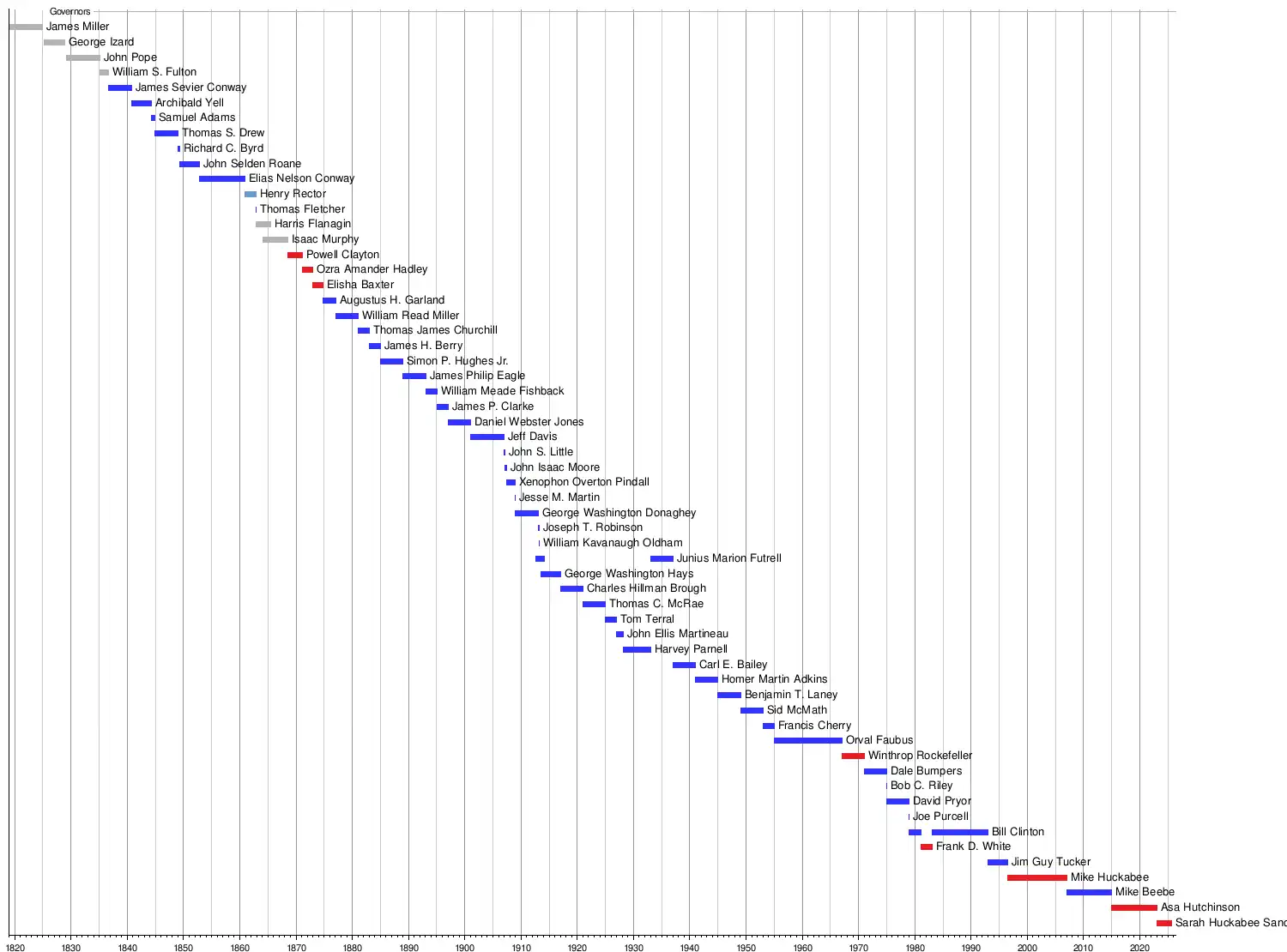 Arkansas was a strongly Democratic state before the Civil War, electing only candidates from the Democratic party. It elected three Republican governors following Reconstruction, but after the Democratic Party re-established control, 92 years passed before voters chose another Republican.