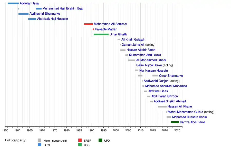 | 8 | Ali Khalif Galaydh (1941–2020) | 8 October 2000 | 28 October 2001 | 1 year, 20 days | Independent | — | |