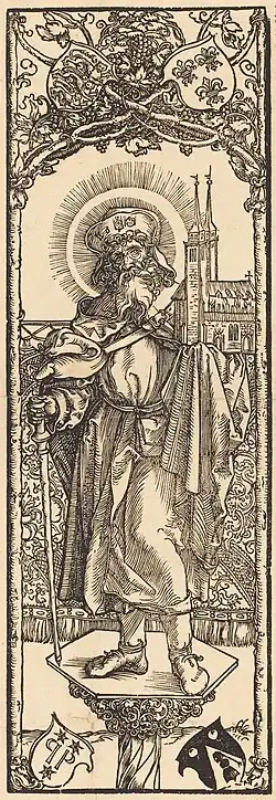 One of the earliest list of woodcuts by Dürer was assembled in 1808 by Adam Bartsch in his "Le Peintre Graveur" volume 7[1] and in the appendix. In 1862 Johann David Passavant expanded "Le Peintre Graveur"[2] adding additional woodcuts. Bartsch and Passavant works, which were organized alphabetically, are the source of "B." and "P." numbers, referenced by all the later books.[3][4][5][6] Another often cited reference is 1903 "Catalogue of Early German and Flemish Woodcuts in the British Museum, Vol. 1" by Campbell Dodgson[6] organized by date and often referenced using "C. D." numbers. In the list below numbers used in 1938 "Albrecht Dürer: Complete woodcuts" (German: Albrecht Dürer: Sämtliche Holzschnitte) by Otto Fischer[4] were provided, as this book offers a catalog of most Dürer woodcuts printed in the original size.