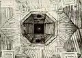 It consisted of a square (12 × 12 m) large main hall. The walls were 6 m high; it was 10.20 m to the highest point of the vault, and the floor was a few steps lower than the outer rooms. On the west side there was a vestibule and above it a gallery with arcades. A two-story corner pavilion stood to the right and left. The north and south sides were flanked by women's dreams. The main building had a three- story tent roof, with the upper step transitioning to an octagonal point. The corner pavilions had a two-story roof. Inside, four wooden pillars supported the vault; they divided the floor plan into nine equally sized fields. In the middle stood the bima; it was in the shape of an octagonal arbor with a canopy with a crown on the top. | ![]()