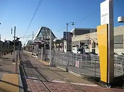 On July 17, 2004, Metro began construction on a 6 miles (9.7 km) extension of the Gold Line light rail line called the Gold Line Eastside Extension, which replaced a once-planned Red Line (now the B Line) subway extension.[7] The light rail extension runs from Union Station through Little Tokyo, ending at the corner of Pomona and Atlantic Boulevards in East Los Angeles. One of the stations on the extension was the at-grade Little Tokyo/Arts District station, located east of Alameda Street between 1st and Temple Streets. The station began operations with the opening of the Eastside Extension on November 15, 2009.[8] However, the at-grade station only operated for nearly eleven years.