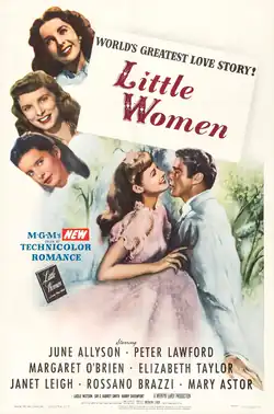 Little Women is a 1949 American coming-of-age romantic drama film produced and directed by Mervyn LeRoy from a screenplay by Andrew Solt, Sarah Y. Mason, and Victor Heerman, based on the 1868–1869 two-volume novel of the same name by Louisa May Alcott. Filmed in Technicolor, the film stars June Allyson, Peter Lawford, Margaret O'Brien, Elizabeth Taylor, Janet Leigh, Rossano Brazzi, and Mary Astor.[2][3] The original music score was composed by Adolph Deutsch and Max Steiner. Little Women marked the American film debut of Italian actor Rossano Brazzi, and was the final film appearance of Sir C. Aubrey Smith, who died in 1948.[4]