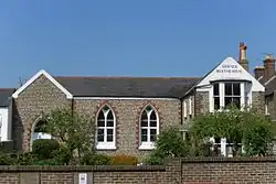 The former school is L-shaped, with a long south wing and a projecting east wing. The façade has flint cobbles with red-brick dressings and grey-brick quoins.[3][4][7] The main wing, of three bays, has two pointed-arched windows with inset pairs of lancet and a similar arched entrance on the left side in a projecting bay.[4][7] The east wing has a full-height canted bay window facing south, set below a stuccoed gable with the painted legend friends' meeting house.[7] This two-storey section was originally the schoolmaster's accommodation.[3]