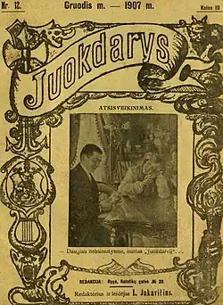 But now, the most important historians and museologists of Lithuania like Almantas Šlivinskas, Leopoldas Rozga or Leonas Peleckis-Kaktavičius, consider him one of the most important writers and publishers of Lithuania. He produced more than two million books and performed more than 280 plays in 1898–1938.[1] From 1888 to 1891 he worked in Šiauliai (Lithuania) as a journalist and writer. In 1891, he settled in Riga (Latvia), where he started working as judge and administrator of the railway company. In 1904, he opened his own printing house (AB Lietuvos Knygynas) and his own bookstore in Riga (Latvia). In 1909, he founded the newspaper Rygos naujienos which maintained its activities until 1915.[2] He also collaborated with other newspapers and journalists like his friend Antanas Smetona (writer, journalist and the first president of the Republic of Lithuania). It should be mentioned that Antanas Smetona wrote about Liudvikas Jakavičius in his memories, written in Cleveland, Ohio, US, in 1960.[3] In 1910, Jakavičius founded The Society of Lithuanian Theatre of Riga. In 1914, he financed the construction of the Lithuanian Theater of Riga. That same year he founded the Lithuanian–Latvian Savings Bank. His bank grew up rapidly, but it was expropriated in 1915 by the State Bank of the Russian Empire, as a result of the beginning of the First World War. In 1916, all his business was paralyzed and confiscated by the outbreak of the First World War and he changed his residence to Saint Petersburg (Russia). He bought 15,000 USD (equivalent to US$350,000 in 2014) in printing equipment and moved the machinery in secret to Saint Petersburg, where he continued with his printing house spreading Lithuanian language.