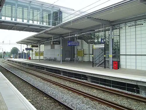 Liverpool South Parkway station is a railway station and bus interchange in the Garston district of Liverpool, England. It serves, via a bus link, Liverpool John Lennon Airport in the neighbouring suburb of Speke, as well as providing an interchange between main line services and the Merseyrail rapid transit/commuter rail network. Opened in 2006 on the site of the former Allerton railway station, it also replaced the nearby Garston station.