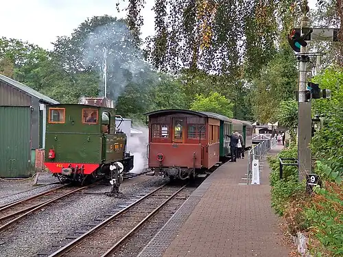 Llanfair Caereinion railway station located in Llanfair Caereinion is the Western terminus of the 2 ft 6 in (762 mm) narrow gauge Welshpool and Llanfair Light Railway. The locomotive running shed and workshops are located here, along with a tea room and gift shop. The original corrugated iron booking office and waiting room survive and have been restored for use as the registered office of the company.[2]