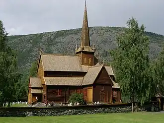 Lom Stave Church, which is located in Fossbergom, is believed to have been built in 1158, making 2008 the 850th anniversary. It was enlarged in 1634, with further addition of two naves in 1667. It is believed that the church was originally surrounded by a circumambulatory passage, like many other Norwegian stave churches, but that this passage was removed when the two side wings were added. A few Runic inscriptions can still be seen in the church. The church also contains numerous paintings from the 17th and 18th centuries with religious motifs. Many of the paintings were made by local artist Eggert Munch, a distant relation of the famous Edvard Munch. The church also contains numerous examples of local woodcarving, as seen in the elaborate acanthus scrolls adorning the pulpit. Carved dragon figures on the roof are old symbols of protection against evil. It is still in use as the local church.