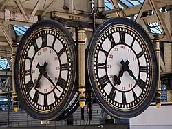 A four-faced clock hangs in the middle of the main concourse. Each panel has a diameter of 5 feet 6 inches (1.68 m). It was erected as part of the early 20th century rebuilding and designed by Gents' of Leicester. In 2010, the clock was fitted with technology to automatically switch to and from British Summer Time.[72][73] Meeting "under the clock at Waterloo" is a traditional rendezvous.[74][75]