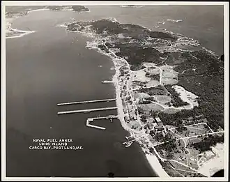 During World War II, Casco Bay became U.S. Navy base Sail for destroyers escorting HX, SC, and ON convoys of the Battle of the Atlantic.[15] Facilities constructed on the island included the Torpedo Control Officers School of the Portland Naval Training Center, a navy supply pier with a naval fuel annex[16] often cited as a source of contamination for both the island's marsh and Casco Bay, and the Naval Auxiliary Air Facility Casco Bay seaplane base operated as part of Naval Air Station Brunswick from 14 May 1943 to 15 December 1946.[17][18] The United States Army Coast Artillery Corps built two batteries of 90 mm dual-purpose guns on the island as the Long Island Military Reservation, part of the Harbor Defenses of Portland.[19] On one of the island's highest hills, a 65-foot concrete tower was constructed with a 25-foot wooden superstructure on top, as a radar observation station.[20]
