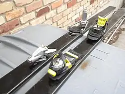 The Nevada patents ran out in 1976, a similar models with long-travel toes quickly appeared from other binding manufacturers, starting with Salomon.[4] These replaced earlier designs, which generally used a single cup-shaped piece that fitted over the entire toe flange (as opposed to the toe, as in the original Nevada). These had the disadvantage of requiring careful adjustment to fit the height of the toe flange, and could be impacted if snow on the bottom of the heel lifted the toe upward. Today the Nevada-style "two finger toe" is universal among modern bindings.
