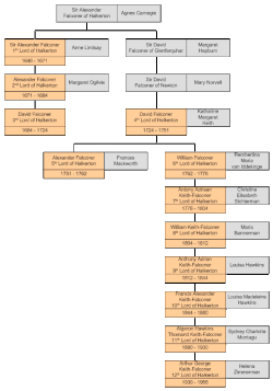 - David Falconer, 4th Lord Falconer of Halkerton (1681—1751), grandson of the brother of the first lord, married Lady Katharine Margaret Keith (daughter of William Keith, 2nd Earl of Kintore)