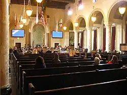 On July 1, 1925, Los Angeles voters passed a new city charter and replaced the at-large system with a district system with fifteen new single-member districts.[35] Each district was to be approximately equal in population, based upon the voting in the 1922 California gubernatorial election, and would redistrict every four years. The numbering system established for the City Council districts began with the 1st district in the San Fernando Valley and ended with the 15th district in the Los Angeles Harbor Region. In 1928, the new Los Angeles City Hall was completed, and the City Council moved to a room there from the previous Romanesque Revival building used.[36][37]