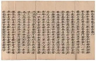 The Lotus Sūtra (Sanskrit: Saddharma Puṇḍarīka Sūtram, lit.'Sūtra on the White Lotus of the True Dharma'; traditional Chinese: 法華經; simplified Chinese: 法华经; pinyin: Fǎhuá jīng; lit. 'Dharma Flower Sutra')[1] is one of the most influential and venerated Buddhist Mahāyāna sūtras. It is the main scripture on which the Tiantai along with its derivative schools, the Japanese Tendai and Nichiren, Korean Cheontae, and Vietnamese Thiên Thai schools of Buddhism were established. It is also influential for other East Asian Buddhist schools, such as Zen. According to the British Buddhologist Paul Williams, "For many Buddhists in East Asia since early times, the Lotus Sūtra contains the final teaching of Shakyamuni Buddha—complete and sufficient for salvation."[2] The American Buddhologist Donald S. Lopez Jr. writes that the Lotus Sūtra "is arguably the most famous of all Buddhist texts," presenting "a radical re-vision of both the Buddhist path and of the person of the Buddha."[3]