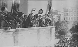 After an Allied force had landed at Salonica in neutral Greece in September 1915 both to defend Salonica and support the hard-pressed Serbian Army in its struggle to defend Serbia against a Central Powers offensive, the National Schism developed in Greece between pro-Allied Prime Minister Eleftherios Venizelos and the pro-Central Powers King Constantine I.[8] In the autumn of 1916, Venizelos and his supporters created a separate Greek government at Salonica, and the French then led Allied efforts to pressure Constantine I into a more pro-Allied stance.[8] Although he disliked interfering in the affairs of a neutral country, Dartige du Fournet aboard his flagship, the battleship Provence, led a French naval squadron into the Bay of Salamis which seized and disarmed the Royal Hellenic Navy fleet[8] on 11 October 1916. In late November 1916, the French demanded that the Greek royalist army provide arms and ammunition for pro-Allied Greek volunteers fighting on the Salonica front and, after the Greek government failed to comply, Dartige du Fournet steamed a French naval force into the harbor at Piraeus, Greece, on 1 December 1916 (18 November according to the Julian calendar then used in Greece) and went ashore with a landing party of French sailors in a show of force he believed would intimidate the Greek government into meeting the French demands, beginning what is known as the Noemvriana ("November Events") or "Greek Vespers."[8] After Dartige du Fournet and his landing party reached Athens, the Greeks still refused to turn over any arms or ammunition and, to the surprise of the French, a battle broke out in which Dartige du Fournet and his party were cut off from the harbor.[8] Torpedo boats and the French battleship Mirabeau shelled Athens to enable the French ashore to disengage.[8] Dartige du Fournet finally negotiated a ceasefire after 70 French sailors were killed, and the vastly outnumbered French retreated to Piraeus and withdrew by sea on 3 December 1916.[8]