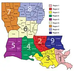 The Louisiana Department of Health provides public health services and oversight across Louisiana in nine regions.[10]