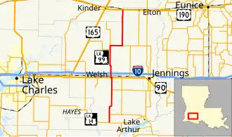 The highway bisects the sparsely populated Jefferson Davis Parish as it zigzags along rural section line roads. Roughly halfway along its route, LA 99 passes through the town of Welsh and an interchange with Interstate 10 (I-10), the region's main east–west highway. It also intersects US 90, an older parallel corridor that now acts largely as a business route in the area.