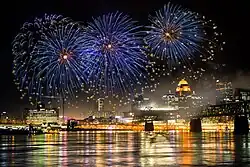 Louisville Waterfront Park is both a non-profit organization and an 85-acre (340,000 m2)[1] public park adjacent to the downtown area of Louisville, Kentucky and the Ohio River. Specifically, it is adjacent to Louisville's wharf and Riverfront Plaza/Belvedere, which are situated to the west of the park. Once a wasteland of scrap yards and abandoned industrial buildings, Waterfront Park is now a vibrant green space that welcomes over 2.2 million visitors each year. Located in the park is the Big Four Bridge which connects the city of Louisville with the City of Jeffersonville, Indiana. Waterfront Park is home to some of Louisville's most exciting celebrations, such as the Fourth of July at Waterfront Park, Forecastle Festival, WFPK Waterfront Wednesdays and Thunder Over Louisville.[1] In 2013 the park won the Rudy Bruner Award for Urban Excellence a national design award that seeks to identify and honor places that address economic and social concerns in urban design.[2]