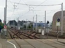 In other aspects, the two lines are identical except that the inter-axis width between the tracks on the Green Line is slightly wider than on the Red Line. The construction planning for the Green Line ensures a distance of track centres at 3,400 millimetres (11 ft 1+78 in) including a 400 millimetres (15+34 in) extra for the kinematic envelope of metro trains.[40] This does not relate to the track gauge of 1,435 mm (4 ft 8+12 in), which is identical on both lines. This will allow wider metro trains be run on the same tracks if a proposed upgrade to full metro service is implemented.[41] This is possible because the route uses an old railway line and as such has few interactions with vehicular or pedestrian traffic. The Railway Procurement Agency has stated (November 2006) that "We still envisage conversion of almost all Luas lines to light metro standard in the long-term".[13] Platform length also varies between lines, with the original 40-metre (131 ft 3 in) platforms lengthened to 55 metres (180 ft 5 in) on the Green Line.[42]