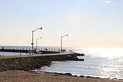 Its most prominent feature is a large crescent-shaped pier made of concrete, approximately 800 ft (240 m) long and reaching around 200 feet (61 m) out into Lake Erie. The pier is flanked by sandy beaches and man-made rock and concrete embankments. On most days, the Davis–Besse Nuclear Power Station in Oak Harbor, Ohio, and the Toledo Harbor Light can be seen from the pier. The city is served by Mason Consolidated Schools.