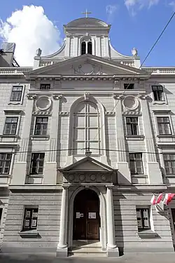 The Lutheran City Church is located at Dorotheergasse 18, next to the Reformed City Church and opposite of the auction house Dorotheum. It was built in the Renaissance period and has a neoclassical facade. There is a triangular pediment above the main entrance. A blind, round arched window is attached to this pediment. It is flanked by two pilasters on each side and topped by large triangular pediment. The Lutheran City Church has no steeple, but a bell-storey.