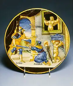 ![]() Hypermnestra watching Lynceus take her father's crown; Cupid holds up the motto "Love Conquers All." (maiolica plate, 1537, by Francesco Xanto Avelli) | |