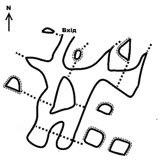 The entrance to the cave was located on the northern slope of a small ravine on the left bank of the river Nichlava. Azimuth binding is the church with. Shmankivchyky - 305 ° at a distance of 2 kilometers.[2][3][4]