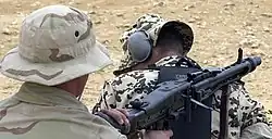The German military instructs that sustained fire must be avoided at all costs. In the bipod mounted light machine gun role MG 3 users are trained to fire short bursts of 3 to 5 rounds and strive to optimize their aim between bursts fired in succession. In the tripod mounted medium machine gun role, MG 3 users are trained to fire both short bursts and longer bursts of 20 to 30 rounds and strive to optimize their aim between successive bursts.[9][10] The Bundeswehr trains soldiers to replace the barrel of the MG 3 after 150 live rounds (or 100 blank rounds) after sustained heavy fire, with a new, cooler one; only once the barrel is hand-warm (able to be held with the bare hand for 30 seconds) can a barrel be reused. Replacing the barrel is a simple procedure on the MG 3. Non-observance of this technical limitation renders the barrel prematurely unusable. Care must be taken when replacing the barrel as after extended cyclical fire, the barrel can be dangerously hot, potentially approaching white hot. The machine gun crew member responsible for a hot barrel change is issued protective asbestos gloves or a cloth to prevent burns to the hands.[10] The effective rate of fire is about 250 rounds per minute.[11] Some other machineguns have thermally insulated grips attached to their quick-change barrel, at least going back to the ZB vz. 26 design of 1926.