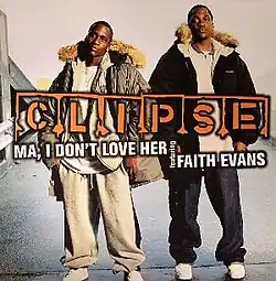 "Ma, I Don't Love Her" is the third official single from the Clipse off their album Lord Willin'. It features Faith Evans and was produced by The Neptunes. The single was released through Arista Records and The Neptunes's Star Trak Entertainment.