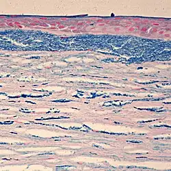 | Colloidal iron staining shows deposition of glycosaminoglycans in the cornea | |