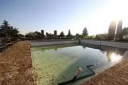 At the middle of the garden's northern side is a large water basin measuring 19 by 19 meters and 2 meters deep.[101] The gardens slope gently from north to south so that this water basin could be used to irrigate them. Water channels ran along the walkways to distribute water. To the south of this basin, near the middle of the gardens, was the large "Central Pavilion" whose construction has been dated to 956 or 957. Very little of its remains have been preserved in comparison to other structures like the Salón Rico and as a result it is still being investigated (as of 2018).[23] It consisted of a rectangular building divided into three naves or parallel halls, aligned roughly north-to-south, with its main entrance facing the Salón Rico. The building stood on a platform one meter higher than the surrounding walkways, and on all four sides was a small water basin which rose to the same height as the platform.[105] The water basins may have been designed and placed so that any observer looking out from inside the pavilion would have seen the reflection of the sky in the water, while an observer from outside would have seen the pavilion reflected in the water. Likewise, the placement of the pavilion in relation to the Salón Rico meant that both buildings would have been reflected in the larger northern water basin.[106] These pools of water would have also reflected light into both buildings through their front archways. They might also have given the impression to observers inside them, when looking out, that the buildings were "floating" on water, since every main entrance was fronted by water.[91]