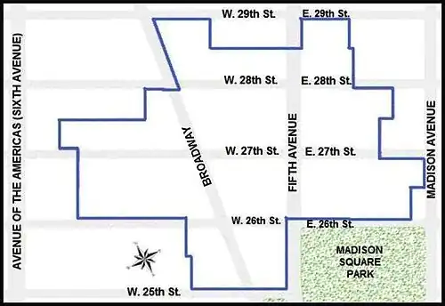Lying north and west of Madison Square Park, the district's boundaries are irregular. The main southern boundary is 26th Street between Madison Avenue almost to the Avenue of the Americas ("Sixth Avenue"), but a portion of 25th Street, from Fifth Avenue to somewhat west of Broadway, is included. On the north, the district goes no further than 29th Street, but portions of it stop at 28th Street or between 27th Street and 28th Street. From east to west, the district is entirely between Madison and Sixth Avenues, without encompassing the entirety of any of these blocks.