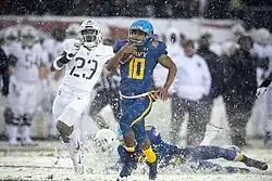 The 2017 Army–Navy Game saw Perry start at quarterback, though Navy went on to lose 14–13. In snowy conditions, he recorded 250 rushing yards on 30 attempts, including a 68-yard touchdown, but penalties on the final drive hampered the Midshipmen offense and resulted in Bennett Moehring's game-winning 48-yard field goal going wide left.[24] Perry's rushing yards accounted for 84 percent of his team's total yardage in the game and were nine more than Army's total.[25] The performance also allowed Perry to break 1,000 rushing yards in 2017; Abey also accomplished the feat, allowing Navy to have its third duo of 1,000-yard rushers in a season.[24] The Midshipmen, who started with a 5–0 record, concluded the regular season 6–6 and played in the Military Bowl against Virginia. Perry scored two touchdowns and rushed for 114 yards before leaving with a foot injury in the 49–7 victory.[26] The 114 rushing yards were the second-most in bowl history behind Reynolds' 144 in 2015.[13]