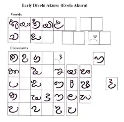 Dhives Akuru developed from Brahmi. The oldest attested inscription bears a clear resemblance to South Indian epigraphical records of the sixth-eighth centuries, written in local subtypes of the Brahmi script. The letters on later inscriptions are clearly of the cursive type, strongly reminding of the medieval scripts used in Sri Lanka and South India such as Sinhala, Grantha and Vatteluttu. There are also some elements from the Kannada-Telugu scripts.[2][3]