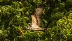 Over time, the shipwrecks of the "Ghost Fleet' have transformed into distinctive, skinny, vegetation-covered artificial islands which provide island, intertidal, and underwater habitats that support a diversity of coastal and marine life, including an abundance of fish, American beavers, and birds such as ospreys, great blue herons, and bald eagles.[10][11] Sediment and seeds deposited inside the hulls of the wrecks have turned some of them into islands often referred to as "flowerpot" wrecks,[25] while others have fused to the shore and form artificial peninsulas which stabilize the shoreline and have a lush covering of plant life.[25] Eastern redcedar (Juniperus virginiana), paw paws of the genus Asimina, persimmon trees, marsh tickseed (Bidens trichosperma), and pickerel weed of the genus Pontederia grow on the wrecks, providing a home for various animal species including ospreys, who visit the sanctuary each spring and summer and build their nests on the wrecks.[25][26] At least one beaver lodge has been noted on a wreck.[25] Vegetation on the wreck of SS Afrania includes swamp dogwood (Cornus amomum), yellow iris (Iris pseudacorus), drooping star of Bethlehem (Ornithogalum nutans), false indigo (Amorpha fruticosa), and a 33-foot (10 m) tall American elm (Ulmus americana).[13]