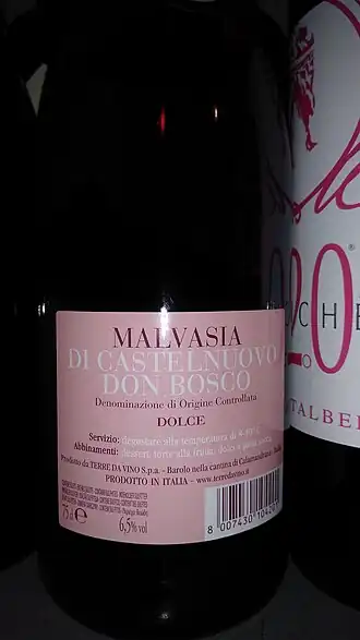 - ^ a b "Malvasia di Castelnuovo Don Bosco DOC". Italian Wine Central. Retrieved 6 October 2019.