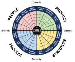 The system integrates the four organizational components of Product, Structure, Process and People. In addition, the system is based on the 4 capabilities of rapid problem solving underlying the Toyota Production System:[1]