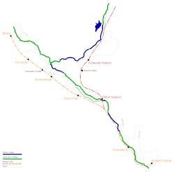 Thirty three bridges were constructed, along with stone drainage facilities to keep water from the cuttings.[28] The railway company was forced to change the design of some of these bridges, as insufficient room was given for the locomotives and carriages on the track to pass between the bridge supports, which were only 10 feet (3.0 m) wide. With only 12 inches (30 cm) of space between some vehicles and the bridge supports, a report by the Inspector of Railways on 11 December 1846 concluded that they were dangerous. On 19 November 1842 a guard named William Parker was killed on the railway, his skull found fractured, and on 26 July 1844 a guard named James Cook was killed as he leant out and was struck by a support. It was also reported that the distance between rails at these bridges was only 4 feet (1.2 m), whereas the normal distance was 6 feet (1.8 m).[27]