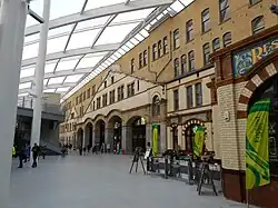 The original M&LR single-storey offices facing Hunt's Bank Approach were built in the Italianate style in sandstone ashlar with slate roofs in 1844. They were later enlarged and given a second storey. William Dawes built the station's larger extension for the L&YR in 1909. It is at right-angles to the north end of the old station giving the enlarged station an L-shaped plan. Facing Victoria Station Approach, its façade is in the Edwardian neo-Baroque style, four storeys high and 31 bays to the rounded corner at the south-east end. The ground floor windows have rounded heads and those on the floors above are square. The ornate glass and iron canopy along the façade displays the names of destinations that the station served in Art Nouveau lettering.[1] The canopy was damaged by the Provisional IRA's 1996 bomb placed in a street adjacent to the Arndale Centre and was restored four years later.[47]