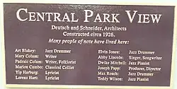 A plaque on the outside wall of the Central Park View, an apartment building at 415 Central Park West (at 101st Street), names the following as "people of note" who have lived there:
