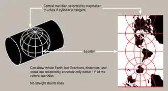 A transverse cylindrical projection is a cylindrical projection that in the tangent case uses a great circle along a meridian as contact line for the cylinder.