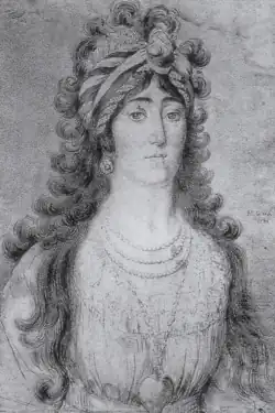 Goya's accompaniment of the recently widowed duchess, combined with certain innuendo expressed in his portraits of her, have exacerbated rumors that the two were lovers.[1] Although this has never been confirmed, the large number of portraits that the artist painted of the duchess suggests, at the very least, a close platonic relationship between the two.