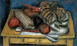 Classified by some as a surrealist painter, María Izquierdo never identified herself as a surrealist. Instead, Izquierdo identified with the Contemporáneos, who believed that Mexican culture should be rightfully seen as a vital contributor to the dominant Western culture. She wasn't afraid to go against popular Mexican art movements and follow her own style of painting. Her culture as a mestiza was an essential part of her artistic style and themes used in her work.[7] Izquierdo was celebrated as an artist with a genuine understanding of native and rural traditions, and her altar paintings were recognized at the time for "their delightful indigenous ingenuousness."[13] Her naive painterly technique, intended to recall the folk painting of regional artisans, heightened the effect.[13] Still, many of her paintings contain unusual subject matters and interesting juxtapositions.[13] Izquierdo's peculiar inclusion into a Mexican nationalist discourse suggest ways of bringing together several sets of discourses too often kept separate: those of Latin America, of feminism, of modernism, and of nationalism.[13] Still, many of her paintings contain unusual subject matters and interesting juxtapositions. Known for her use of bold, rich, and bright colors, most of Izquierdo's paintings were done using oil paints or watercolor.[3] Although she was and is still often compared to Frida Kahlo because both woman launched their careers at similar times, the two have very individual styles. At the beginning she would paint still life and portraits. She experimented with many different styles and techniques; such as, oil painting, watercolor, still life, and landscape.[14]