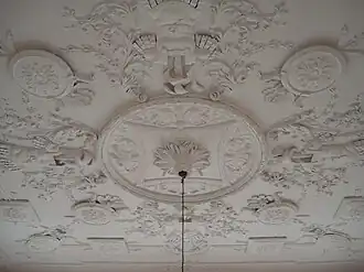 The interior is one of the finest in Scotland.[6][8] Much of the original George II period plasterwork, executed by Thomas Clayton, remains. Clayton was the best plasterer in Scotland of his time and worked for William Adam and others. He worked at other houses, including The Drum in Edinburgh, the Duke's Apartments at Holyroodhouse, at Hamilton Palace, the Duke's house in Lanarkshire, Blair Atholl, Perthshire and Arniston House.