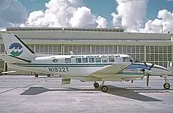The Marco Island Airways fleet initially consisted of six Martin 4-0-4 twin-engine pressurized piston-engine 44-seat airliners (shown in heading image), five examples being operated as at March 1985.[3] Three of the smaller twin turboprop Beech 99 (N1921T, N1922T, N1923T) were included in the fleet in 1973. Four Piper PA-31 Navajo eight-seat airliner was also operated in the early 1980s.[4]