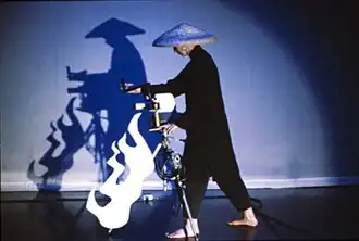 Fisher's early works integrated her idiosyncratic choreography with multimedia technology (low and high), music and poetry, disparate literary and pictorial references, and an introspective sensibility.[44][45][9][3] Critic Charles Shere noted Fisher's approach to using the stage as an area to develop parallel messages (rather than a space to move through), which typically assigned equal weight to elements such as object, light, gesture, rhythm, body, image, sound and word.[46] The New York Times's Jack Anderson described Fisher's early performances as interesting, if obscure, "kinetic puzzles" proceeding by means of metamorphosis, free association, private jokes and far-flung allusions.[14][47]