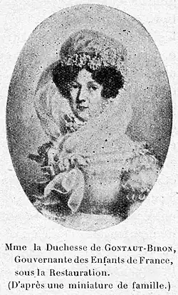 Madame de Gontaut became lady-in-waiting to Caroline, duchesse de Berry, and, on the birth of Caroline's first child, the princess Louise (afterwards duchess of Parma), governess to the children of France. Next year the birth of Henri, duc de Bordeaux (afterwards known as the comte de Chambord), added to her charge the heir of the Bourbons. She remained faithful to his cause all her life. Her husband died in 1822, and in 1827 she was created duchesse de Gontaut. [1]