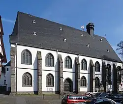 A parish is attested in Lich in the year 1239, which presupposes a church existed by that date.[3] In 1316, the Marienstift was founded by Philip III of Falkenstein, as a collegiate church (German: Kollegiatstift) with ten canons, which was intended to educate young men for the priesthood. Three neighbouring churches were incorporated along with Lich.[4] A large amount of property of the surrounding churches and districts was donated for the maintenance of the college. In the year of the college's foundation, a new, stone church was begun which was roughly two-thirds the size of the present building. The hall church, with a long choir and rood screen was consecrated to Mary on 7 May 1320.[1] It survived less than two hundred years. In 1510 it was entirely demolished to make way for the construction of the present building on the same site. Only a few sections of wall in the west wall survive.[3]