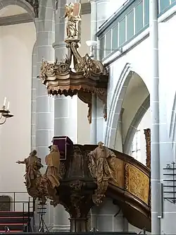 The baroque pulpit was made by the carpenters Diez von Engelthal and Seitz in 1767–1774. It is made in the shape of a eucharist chalice[27] and has five concave sides. The large sculpted figures on the pulpit were made by Franz Martin Lutz of Rockenberg. They depict the four Doctors of the Church, Bernard of Clairvaux, Thomas Aquinas, Bonaventure and Pope Leo I.[9] On top of the richly decorated canopy is a statue of Moses with the Ten Commandments. A dove symbolises the Holy Spirit. The wooden back wall, which once connected the pulpit and the canopy now hangs in the southwestern ambulatory.[28] The connected Neo-Gothic Pfarrstuhl dates from the middle of the nineteenth century. The matching altar and the baptismal font are made out of white-veined, grey-black Lahn marble. The massive altar table rests on a curly support.[29]